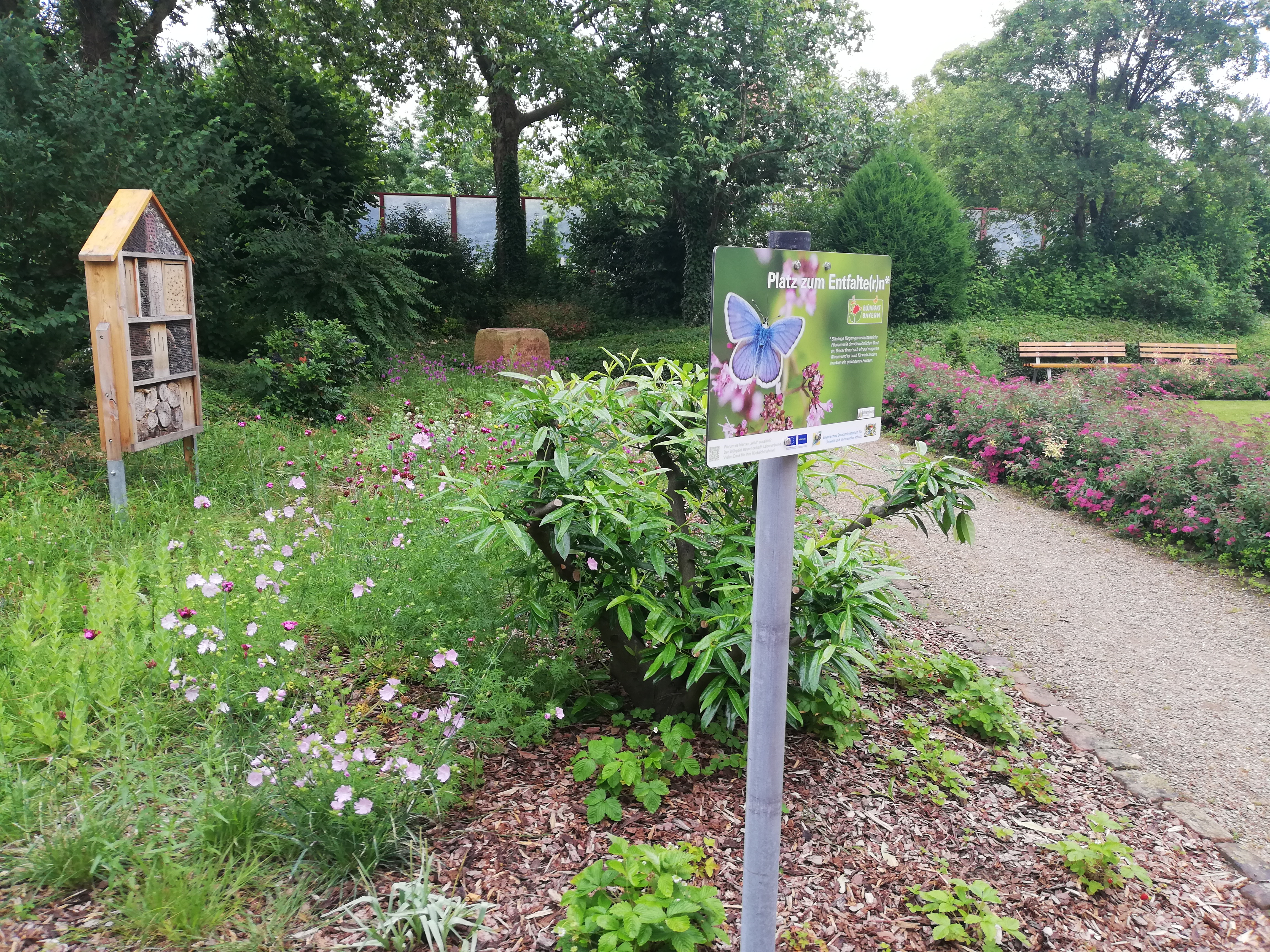Das Starterkit-Projekt in Obernburg am Main besteht aus drei Teilflächen mit ganz unterschiedlicher Ausgangslage. Eines hatten die Flächen gemeinsam: Alle drei boten kaum Nahrungsangebot für Insekten: Teilfläche 1 war ein ehemaliger Lagerplatz an der Schule. Hier wurde Mutterboden aufgebracht und eine gebietsheimische Blumenwiese für das hiesige Ursprungsgebiet (UG) 21 angesät, um eine Wiese zu entwickeln und so Lebensraum für Flora und Fauna zu schaffen. Stein- und Totholzhaufen bieten zusätzlich Nahrung und Wohnstätten. Am Main wurde die Pflege eines Bereichs des Vielschnittrasens (Teilfläche 2) umgestellt und zusätzlich streifenweise gebietsheimisches Saatgut angesät. Da dieser Teil der Stadt in einem anderen UG liegt, wurde hier eine Mischung für das UG 9 gewählt. Beide Maßnahmen sollen dazu führen, dass zukünftig zahlreiche Wiesenblumen auf der Fläche blühen und so zahlreiche Insekten Nahrung finden. Beide Teilflächen (1 und 2) werden ein- bis zweimal im Jahr gemäht, das Schnittgut wird von der Fläche entfernt. Teilbereiche, maximal 20 Prozent der Fläche, werden als Fortpflanzungs- und Überwinterungsstätten stehen gelassen. Im Rosengarten (Teilfläche 3) wurde ein liebloses Beet mit überwiegend heimischen Wildstauden und Insektenmagneten wie der Echten Betonie bepflanzt. Eine ansässige Initiative gestaltete eine Insekten-Nisthilfe. Da sich in Pflanzenstängeln gerne Insekten einnisten, bleiben die abgeblühten Stauden über den Winter stehen und werden erst im späten Frühjahr, nach ein paar warmen und sonnigen Tagen, zurückgeschnitten.