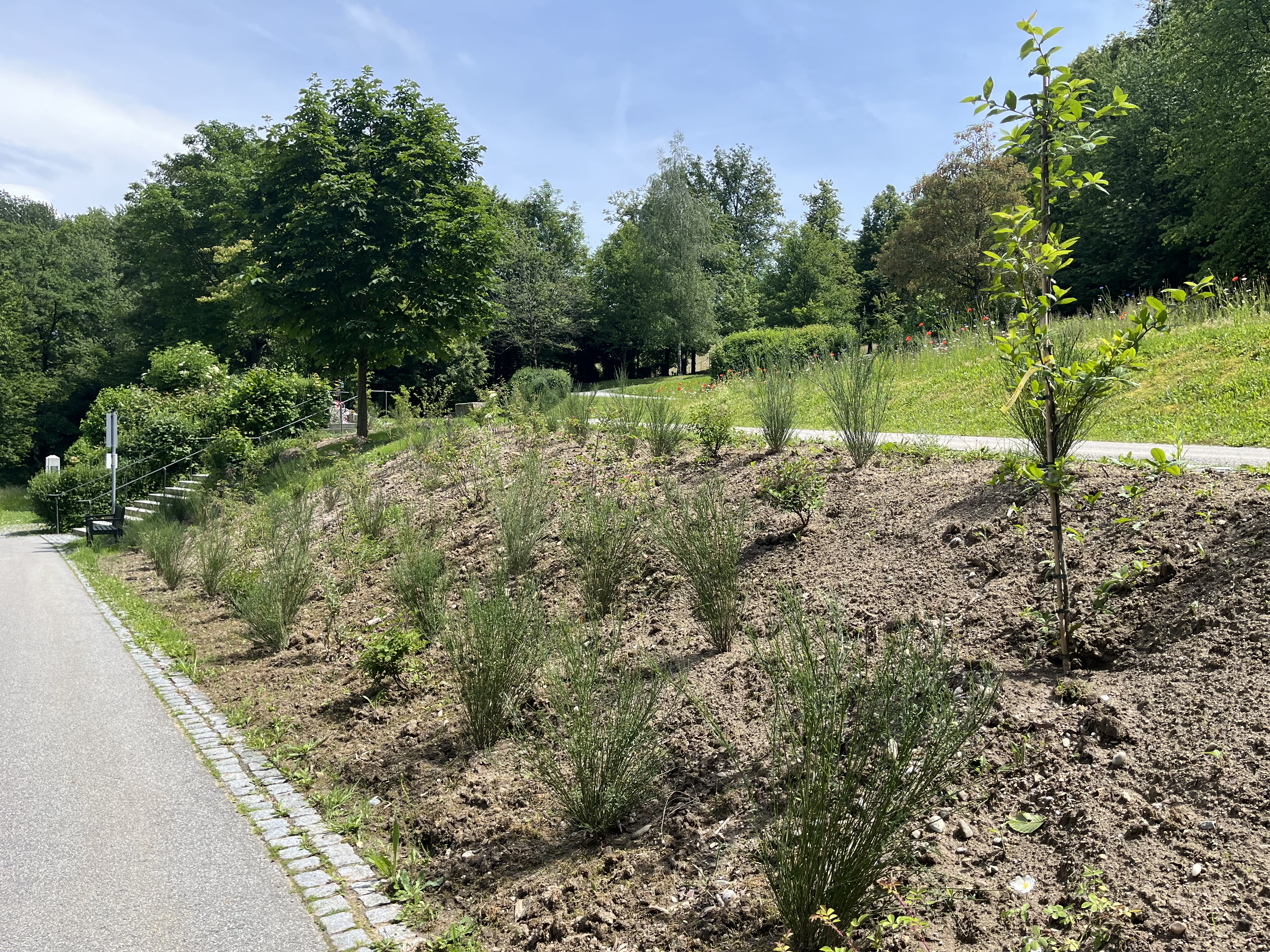 Das Blühprojekt in Deggendorf, gefördert durch ein 5000-Euro-Starterkit des Blühpakts Bayern, hat den örtlichen Friedhof in einen blühenden Park verwandelt. Von März bis April arbeiteten die Mitarbeiter der Stadtgärtnerei und des Bauhofs gemeinsam mit dem Stadtplanungsamt und der Blühpakt-Beraterin für Niederbayern, um die Grünflächen des Friedhofs ökologisch aufzuwerten. Heute ist der Deggendorfer Friedhof ein wahres Paradies für Insekten! Durch die Umwandlung ungenutzter Flächen in artenreiche Blühwiesen, die mit heimischen Pflanzen bestückt wurden, summt und brummt es auf dem gesamten Gelände. Ein neu angelegtes Schattenstaudenbeet bietet Platz für zahlreiche heimische Staudenarten, während an einem Hang einheimische Hecken und Sträucher gepflanzt wurden, um mehr Strukturvielfalt zu schaffen. Neben den Nahrungsquellen wurden auch Nistmöglichkeiten für bodennistende Insekten in Form eines Sandariums geschaffen, und Käfer finden in einer speziell angelegten Käferwiege einen neuen Lebensraum. Diese naturnahe Gestaltung des Friedhofs ist nicht nur ein Gewinn für die Artenvielfalt, sondern trägt auch zur Verschönerung des Stadtbildes bei.