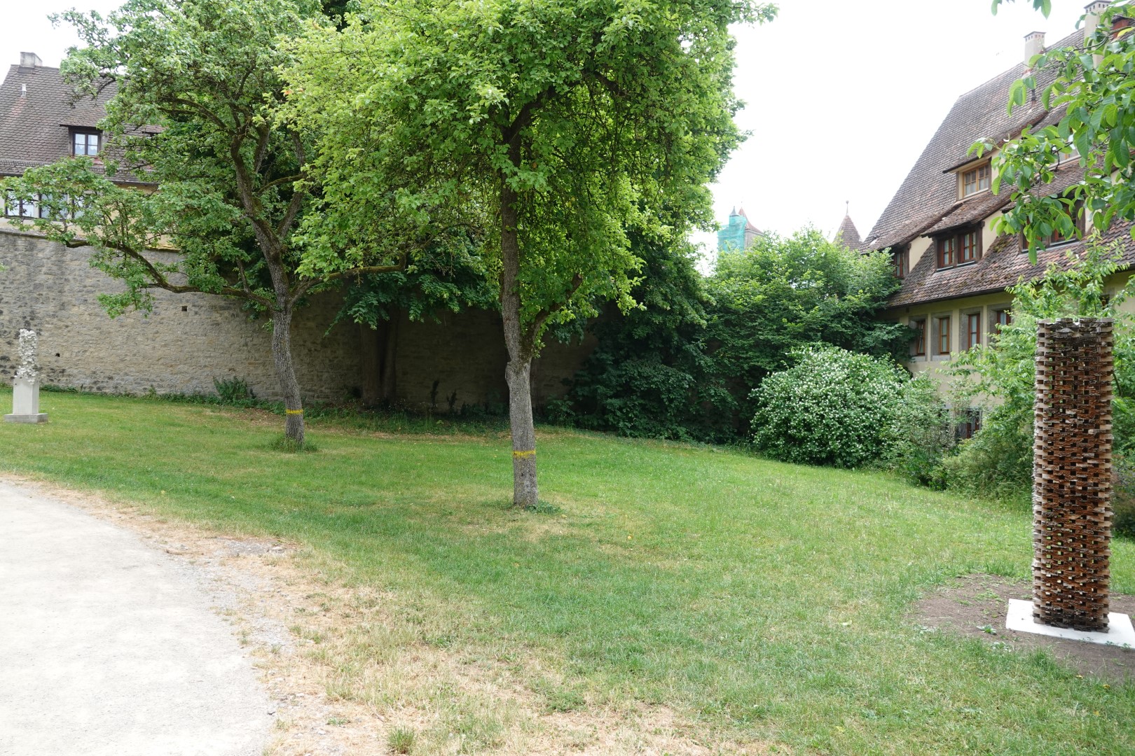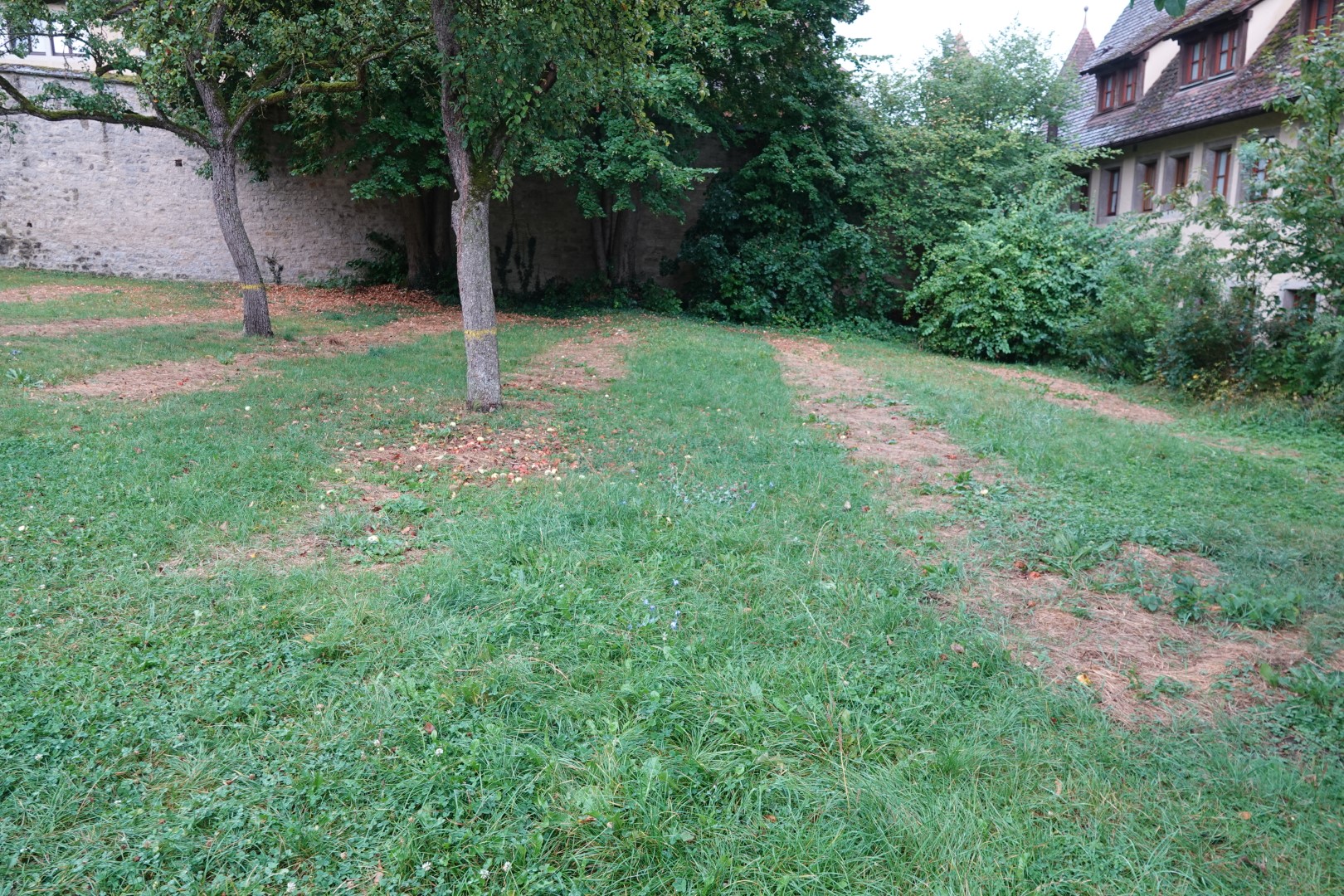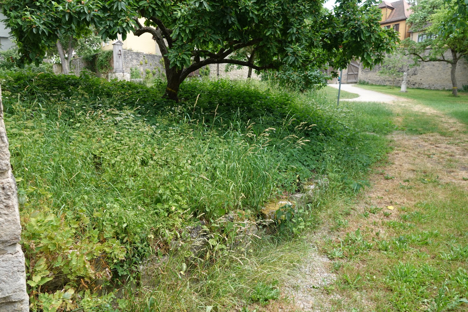 Da der Klostergarten in Rothenburg ob der Tauber touristisch gut besucht ist, sollte durch die ökologische Aufwertung dieser Fläche Naturschutz mit Umweltbildung verknüpft werden. Der häufig gemähte und recht artenarme Rasen sollte durch eine Mahdgutübertragung mit wertvollen Arten angereichert werden. Außerdem wurde ein Beet um eine alte Mispel mit heimischen Stauden bepflanzt und es wurde Totholz ausgelegt. Zusätzlich wurden auch ein kleiner Steinhaufen angelegt und eine Trockenmauer als Beeteinfassung gebaut.